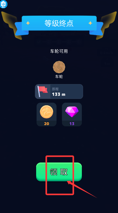 4、車輛抵達(dá)等級(jí)終點(diǎn)后,點(diǎn)擊“領(lǐng)取”按鈕,可獲取車輪、金幣、鉆石等獎(jiǎng)勵(lì)。