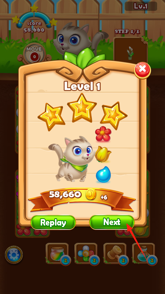 3、第一關(guān)通關(guān),彈出獎勵界面,拿到58660分和三星,想繼續(xù)玩下一關(guān),點Next想重玩這關(guān),點Replay接著挑戰(zhàn)更難的關(guān)卡,積累分數(shù)和獎勵。