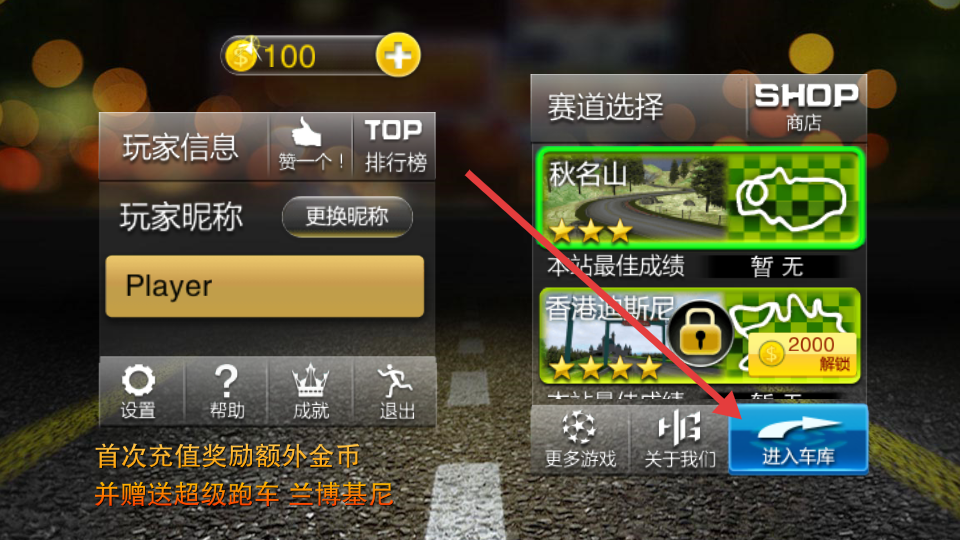 1、進入車庫選擇基礎(chǔ)車輛,通過賽事獎金逐步解鎖蘭博基尼等頂級超跑。