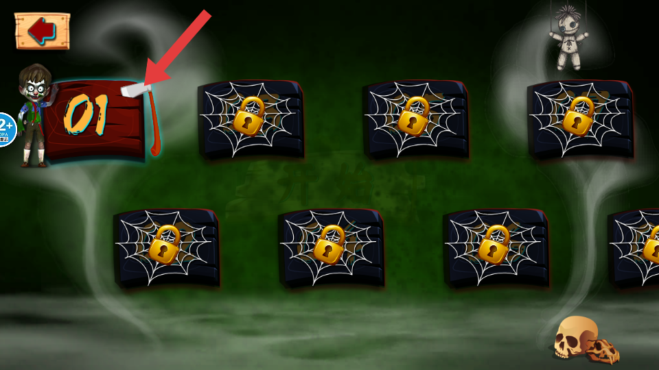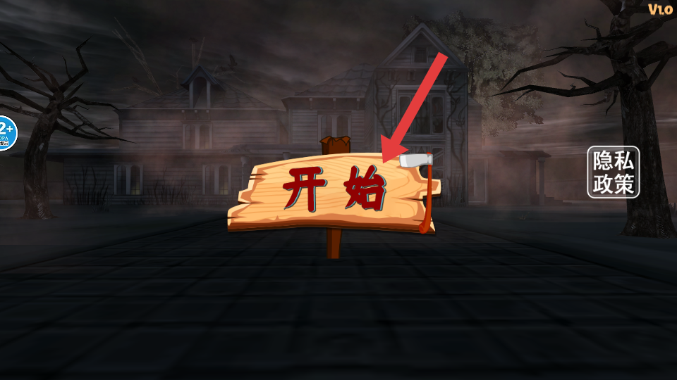1、進(jìn)入游玩的頁(yè)面,點(diǎn)擊屏幕的開(kāi)始的木牌進(jìn)入選擇的關(guān)卡,開(kāi)啟了新的恐怖的房屋的冒險(xiǎn)。
