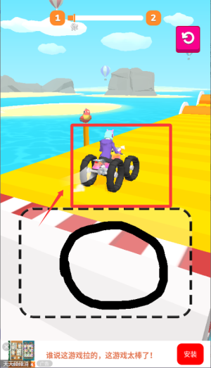 1、進入關卡后看清楚小車路線,用手指在空白處畫個圓圈變成輪胎,畫得連貫些就能啟動車子,不規(guī)則也沒關系能跑就行。