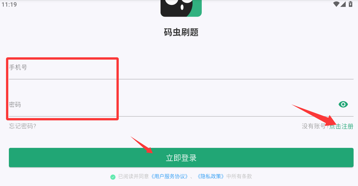 2、輸入手機號和密碼登錄,如果還沒有注冊就點擊注冊。
