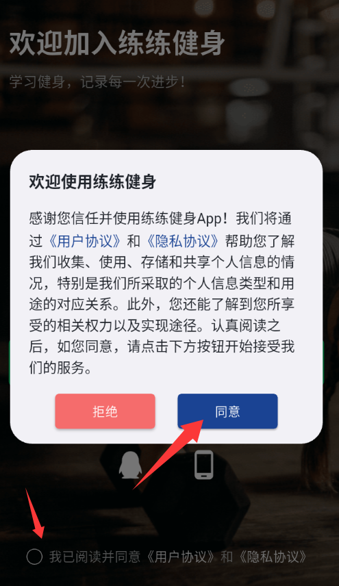 1、點擊歡迎使用練練健身里的同意并進入。