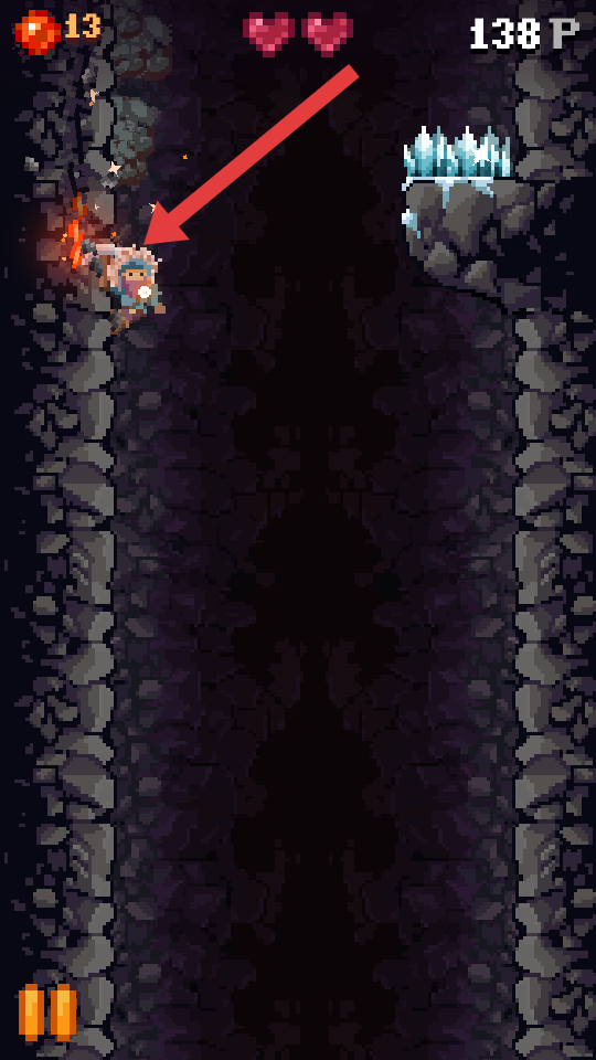 2、下落遇巖壁、冰塊,按箭頭指引調(diào)整點擊時機,借突起物跳躍,避開深溝、尖刺,保生命值雙心。