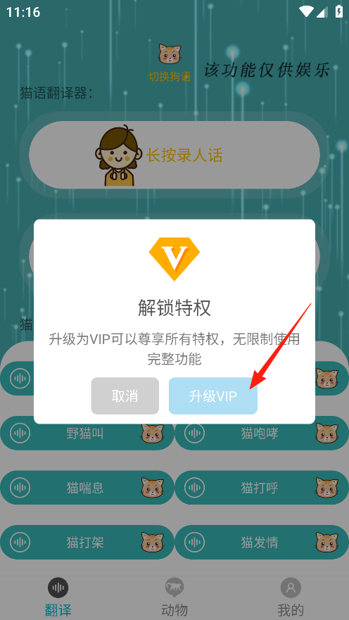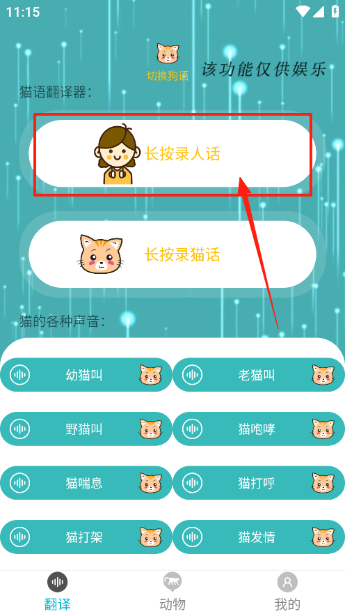 1、有長按錄人話和長按錄貓?jiān)拑蓚€(gè)主要功能區(qū)域,用戶長按長按錄人話區(qū)域,可錄入自己的話語,同時(shí)界面還提供了幼貓叫,老貓叫等多種貓的聲音選項(xiàng)。
