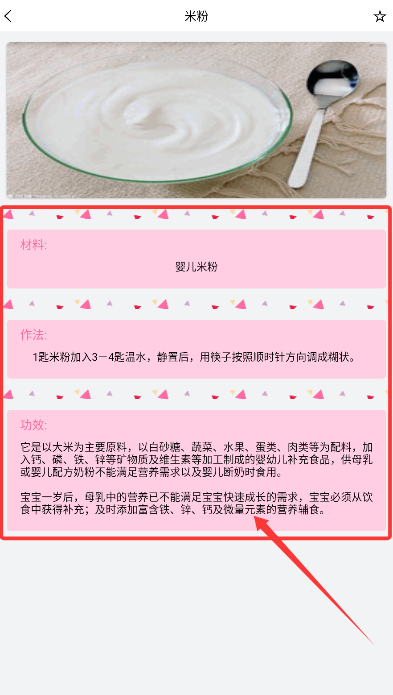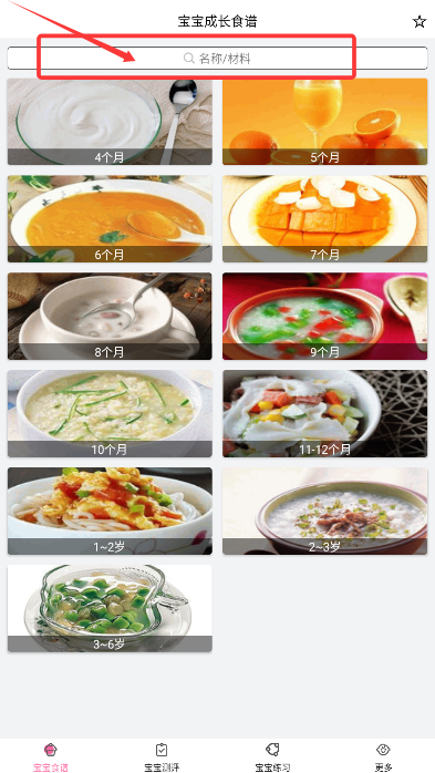 1、首次使用時(shí),在"營(yíng)養(yǎng)食譜"界面可通過(guò)關(guān)鍵詞快速檢索輔食配方。