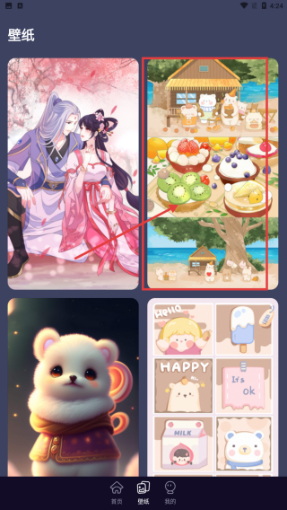 2、切換到壁紙頁面,瀏覽不同風格壁紙,選中喜歡的如美食主題壁紙,進行設置或收藏。
