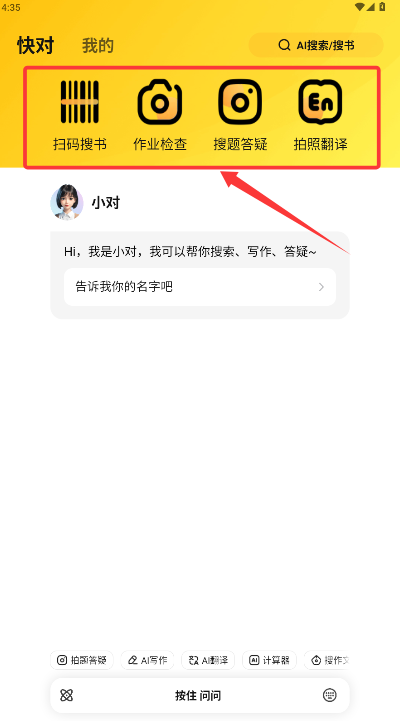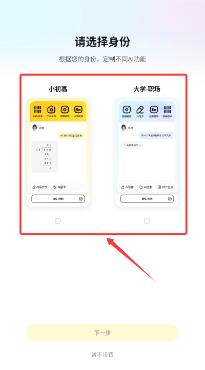 1、首次使用快對(duì)作業(yè)app時(shí)選擇學(xué)習(xí)階段,系統(tǒng)將自動(dòng)匹配相應(yīng)學(xué)段的智能輔導(dǎo)功能。