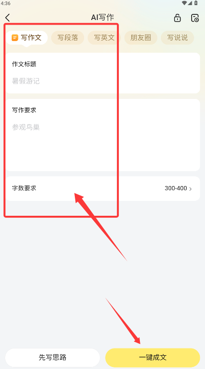 3、智能寫作模塊支持輸入作文題目、寫作要求,自由調(diào)整文章篇幅等具體參數(shù)。