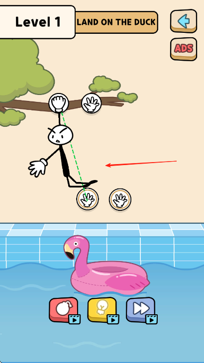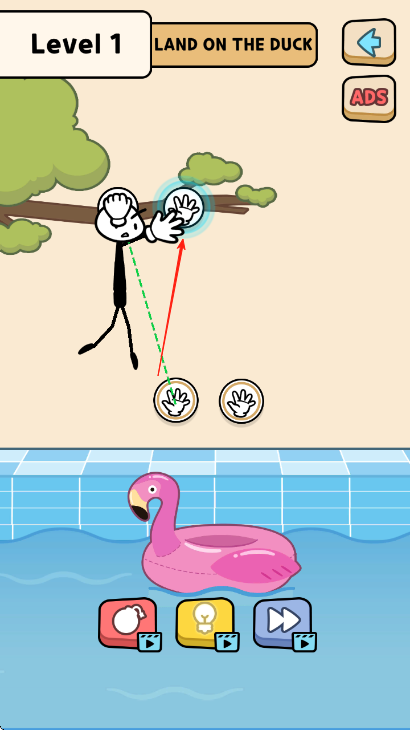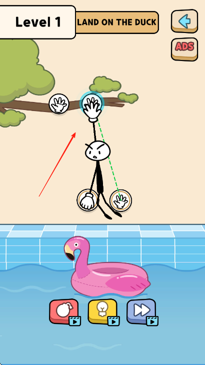 1、進(jìn)入第1關(guān),明確目標(biāo)是讓火柴人【LAND ON THE DUCK】落在鴨子形狀的浮具上,觀察火柴人周圍帶有手圖案的交互點(diǎn)。