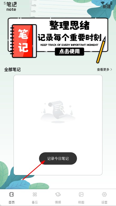 1、打開(kāi)演跡記錄,在首頁(yè)點(diǎn)擊記錄今日筆記,進(jìn)入新建筆記頁(yè)。