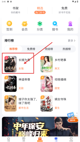 2、打開百度小說APP,在書架頁推薦榜找到長嫂為妻,點擊進入詳情頁。