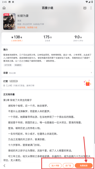 3、在小說詳情頁,可選擇加入書架收藏書籍,或點擊免費閱讀開始閱讀。