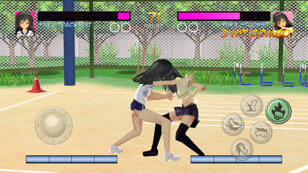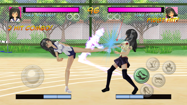 1、格斗對(duì)戰(zhàn)操作:玩家通過(guò)按鍵控制高中女生角色,利用基礎(chǔ)攻擊鍵發(fā)起連續(xù)打擊,當(dāng)能量積累夠時(shí),按下技能鍵釋放專屬技能,在規(guī)定時(shí)間內(nèi)將對(duì)手血量降至零即可獲勝。