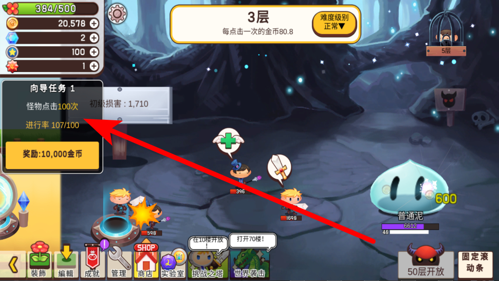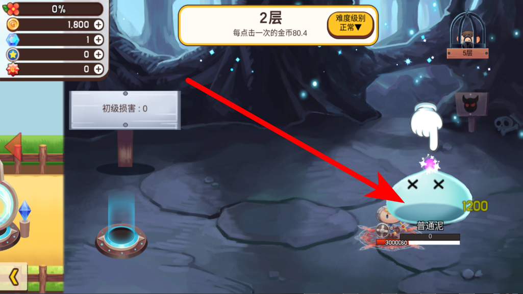 1、進入游戲,在不同層級的場景中,會遇到如普通泥等怪物,點擊這些怪物,可對其造成傷害,同時每次點擊能獲取相應的金幣,積累金幣用于后續(xù)發(fā)展。