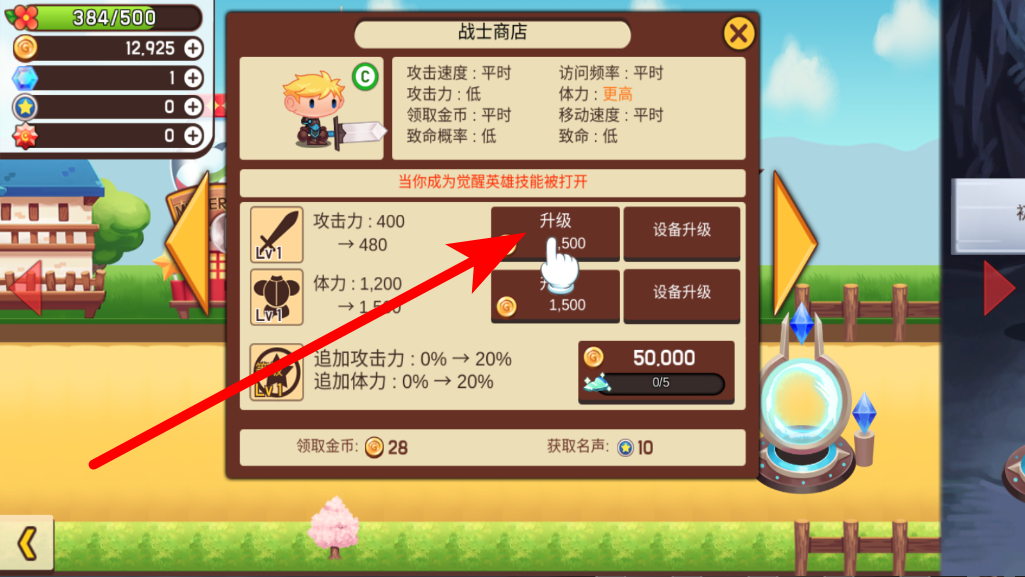 3、戰(zhàn)士商店等角色相關(guān)界面,可對角色的各項能力進行升級,像提升攻擊力、體力等,升級后角色在挑戰(zhàn)怪物等過程中能發(fā)揮更強的作用,助力冒險。