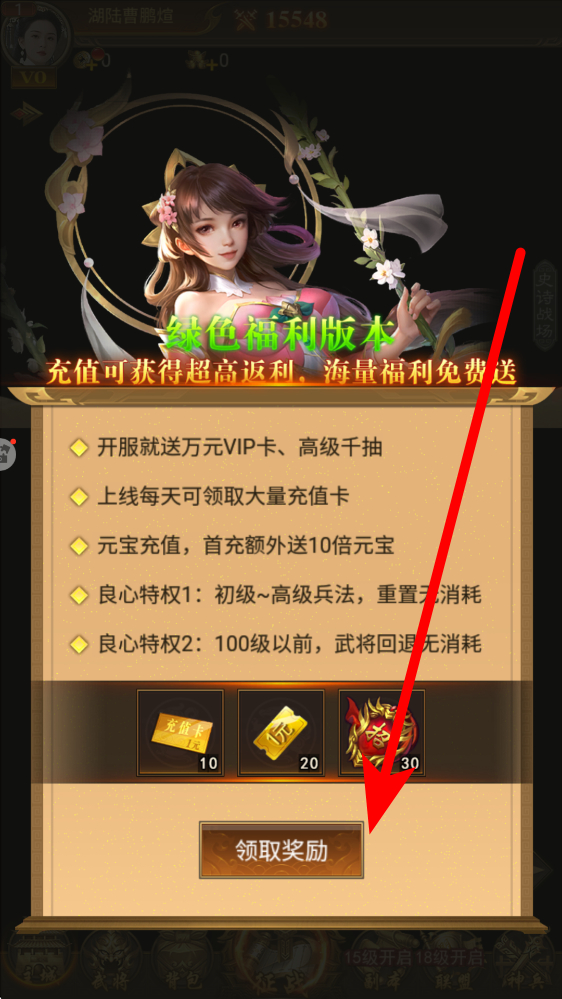 2、然后領(lǐng)取版本福利,在綠色福利版本相關(guān)界面,可領(lǐng)取開服送的萬元VIP卡、高級(jí)千抽等獎(jiǎng)勵(lì),這些福利能為后續(xù)游戲提供助力。