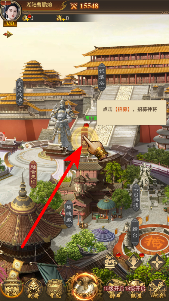 3、接著進(jìn)行招募武將,點(diǎn)擊招募按鈕,可招募神將,像黃月英等武將都有機(jī)會(huì)被招募到麾下,充實(shí)自己的武將陣容,增強(qiáng)戰(zhàn)力。