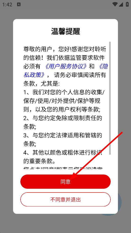 1、在溫馨提醒彈窗中,點(diǎn)擊同意,進(jìn)入聆聽音樂主界面。