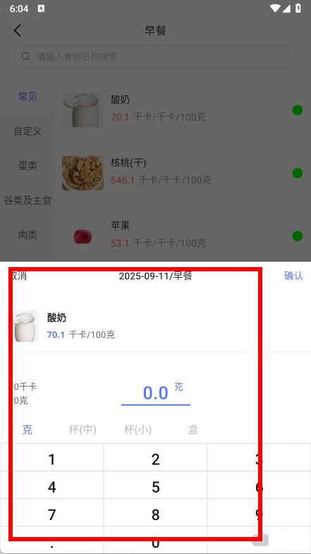 4、選擇目標(biāo)食物,并設(shè)置該食物的重量或食用量,完成后即可記錄早餐的飲食信息。