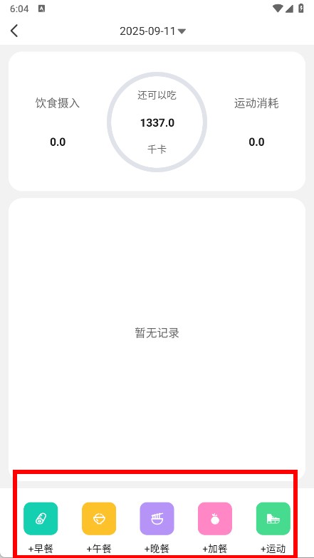 3、在飲食運(yùn)動管理詳情頁面,點(diǎn)擊底部的加早餐按鈕,進(jìn)入早餐食物選擇與記錄界面。