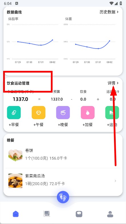 2、在首頁飲食運(yùn)動管理板塊,點(diǎn)擊右側(cè)的詳情按鈕,進(jìn)入飲食運(yùn)動管理詳情頁面。