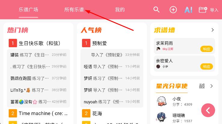 2、在樂(lè)譜列表頁(yè)面,點(diǎn)擊所有樂(lè)譜,查看所有樂(lè)譜內(nèi)容。