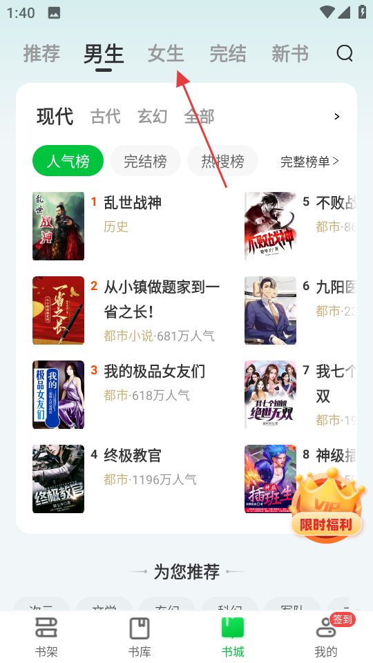 1、在書城頁面,點擊女生標簽,查看女生頻道下的各類小說。