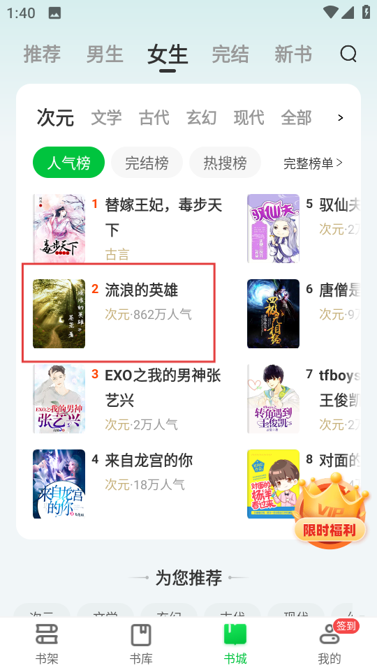 2、在女生頻道的小說,點擊自己喜歡的小說如流浪的英雄進入。