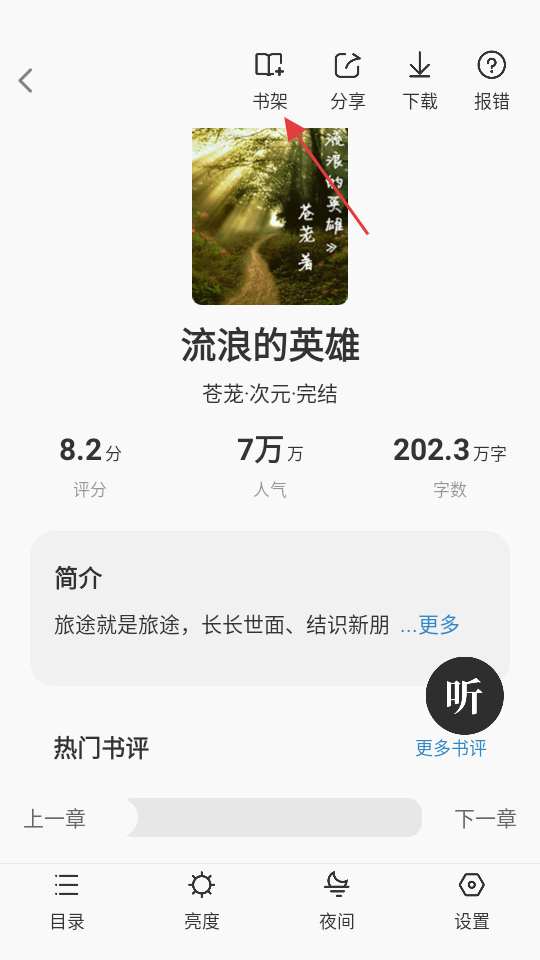 4、在小說菜單頁,可點擊書架按鈕,將小說加入書架,方便后續(xù)閱讀。