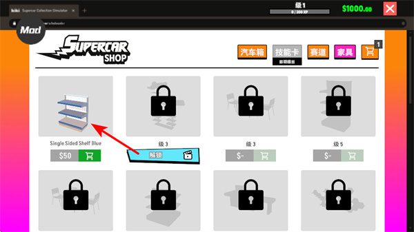 4、在家具界面,選擇Single Sided Shelf Blue貨架,花費(fèi)$50購買,用于店鋪商品陳列,優(yōu)化店鋪布局。