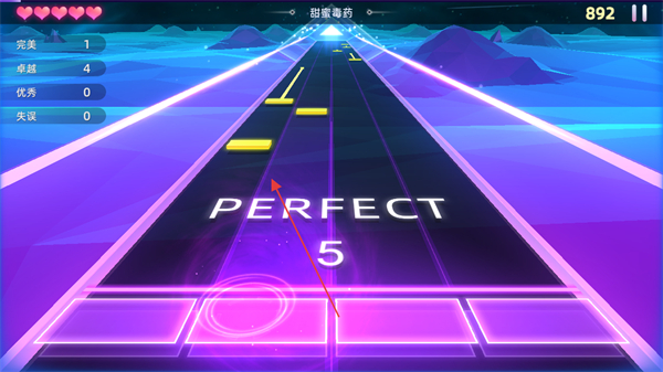 1、進(jìn)入游戲,選擇歌曲如甜蜜毒藥,留意屏幕左側(cè)的評(píng)分統(tǒng)計(jì),包括完美,卓越,優(yōu)秀,失誤次數(shù)。