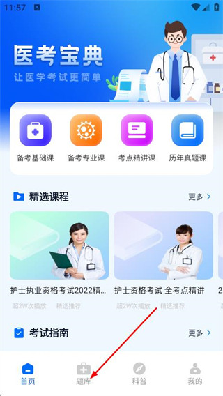 1、進(jìn)入后在首頁,點(diǎn)擊底部的題庫,進(jìn)入題庫頁面。