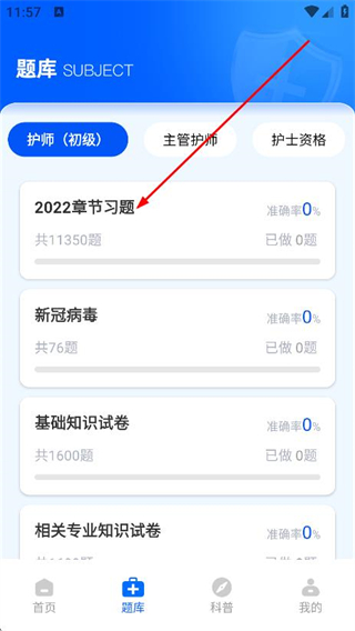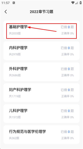 3、在2022章節(jié)習(xí)題頁面,點(diǎn)擊學(xué)科,進(jìn)入該學(xué)科題目頁面。