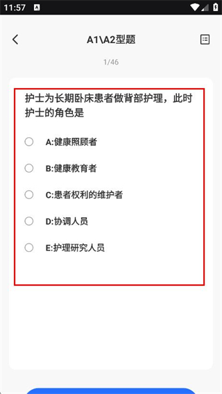 4、隨后可作答題目,護(hù)士為長期臥床患者做背部護(hù)理,此時護(hù)士的角色是。
