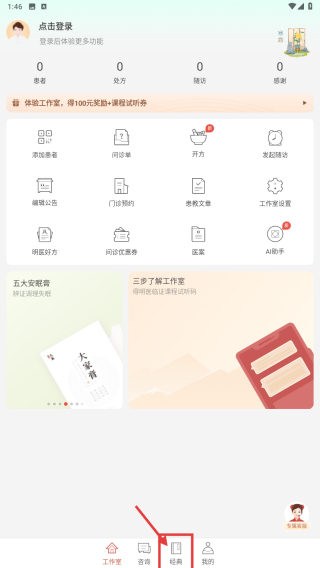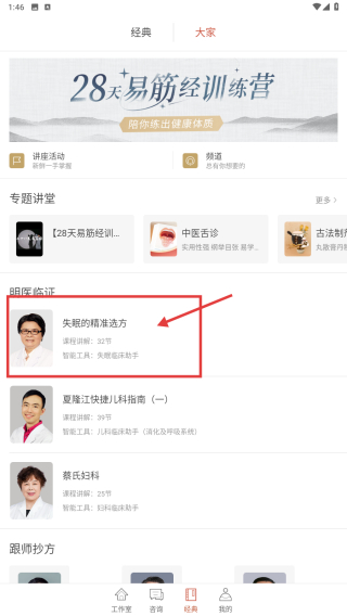 1、打開中醫(yī)學(xué)習(xí)類應(yīng)用,點(diǎn)擊底部經(jīng)典選項(xiàng),進(jìn)入經(jīng)典課程頁面。