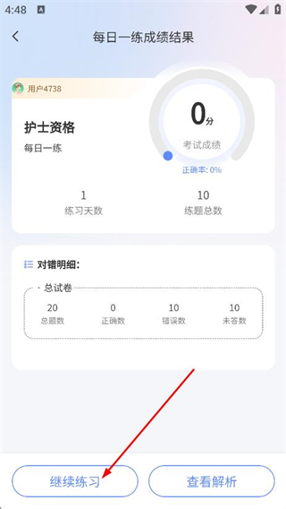 4、在每日一練成績結(jié)果頁面,點擊繼續(xù)練習(xí),可繼續(xù)進行練習(xí)。