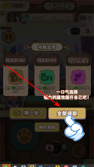 3、點擊全部領(lǐng)取技能獎勵,一次性獲取閃避提升、攻擊速度提升和生命回復(fù)等強力屬性加成。