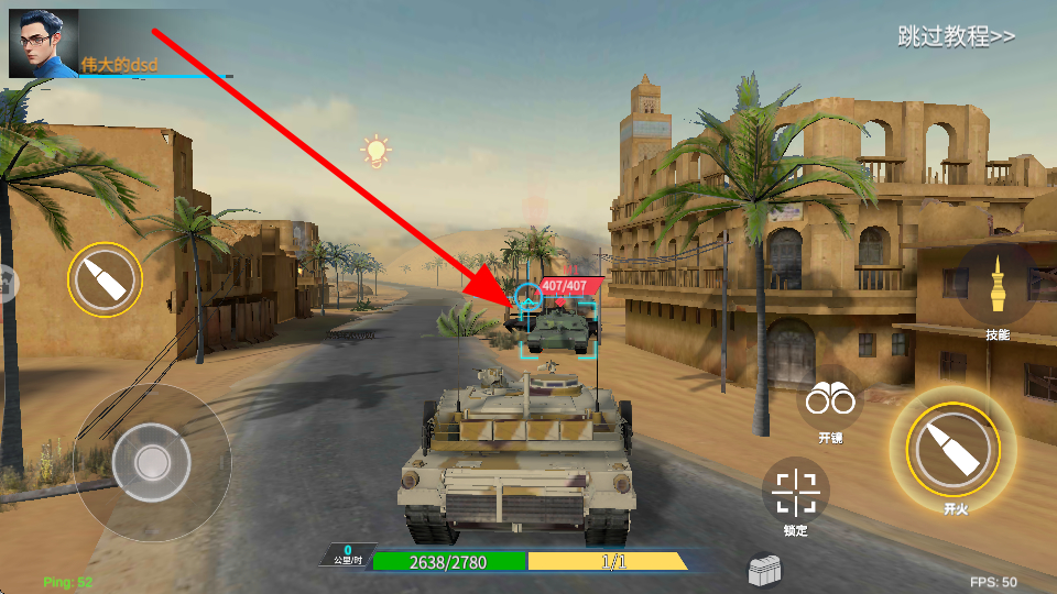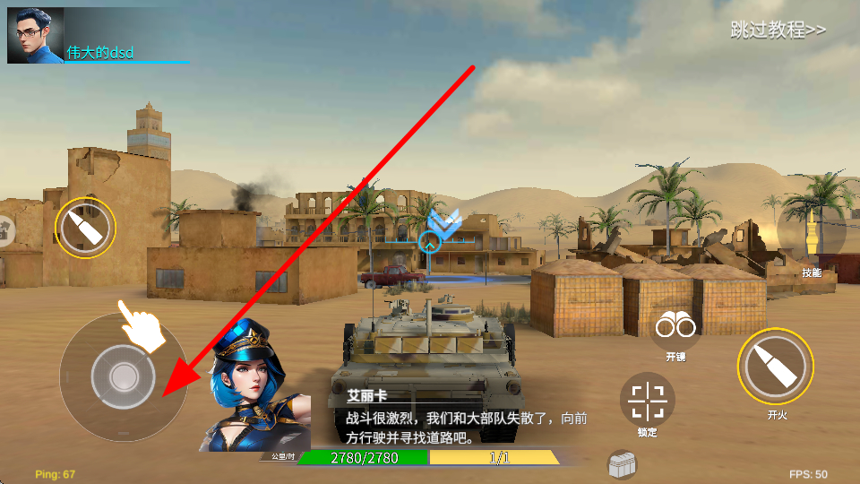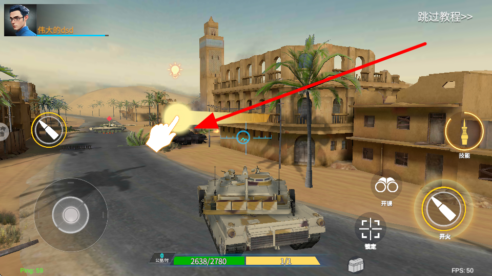 1、移動(dòng)靠左側(cè)虛擬搖桿,手指滑動(dòng)搖桿,能控制坦克向不同方向行駛,躲避敵人攻擊或接近目標(biāo)。