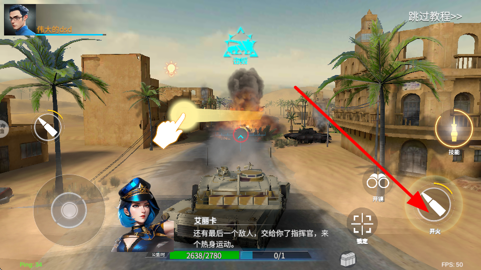 3、點(diǎn)擊右側(cè)開火按鍵,能發(fā)射炮彈攻擊,在敵人暴露弱點(diǎn)或處于合適距離時(shí)開火,傷害效果更好。