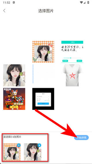 2、進(jìn)入選擇圖片頁面,挑選2-6張需要拼圖的圖片,選好后點(diǎn)擊開始拼圖。