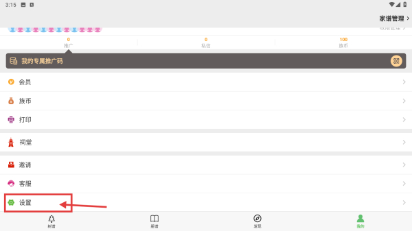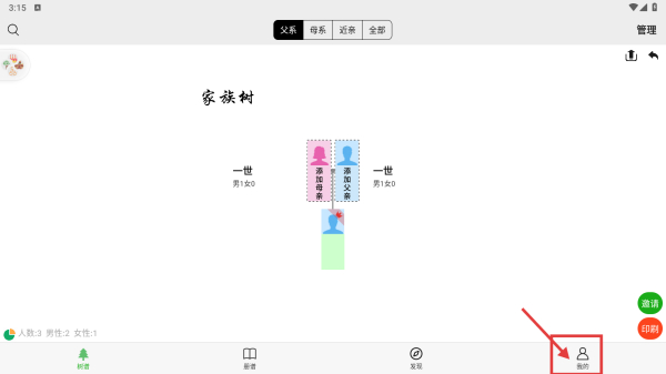 1、打開家族樹應(yīng)用,點(diǎn)擊底部我的選項(xiàng),進(jìn)入個(gè)人中心頁面。