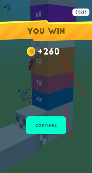 2、當成功完成關卡挑戰(zhàn)后,獲得金幣獎勵,同時還有倍數標識,可能代表獎勵倍數,之后可點擊CONTINUE繼續(xù)游戲。
