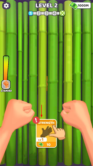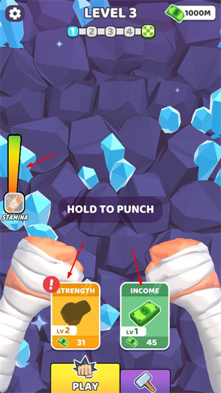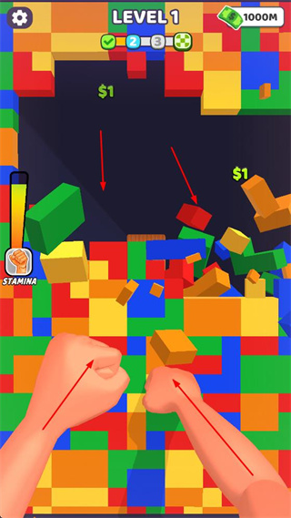 1、通過點擊或長按屏幕,操控拳頭對不同的物體進行破壞。破壞物體時,會獲得金錢獎勵,同時屏幕左側(cè)有體力條,需注意體力消耗。