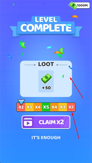 2、成功完成關(guān)卡后,獲得戰(zhàn)利品,如+50金錢,還有倍數(shù)獎勵,可選擇觀看視頻翻倍獎勵,或點擊IT'S ENOUGH領(lǐng)取基礎(chǔ)獎勵。