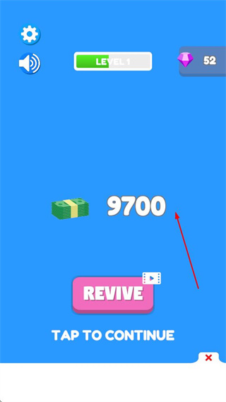 4、若挖礦過程中失敗,會顯示獲得的金錢數(shù)量,可選擇REVIVE或點擊TAP TO CONTINUE繼續(xù)游戲,積累的金錢可用于后續(xù)升級等操作。