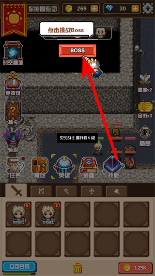 3、戰(zhàn)斗時可點擊BOSS按鈕挑戰(zhàn)強力敵人,擊敗BOSS能獲取豐厚獎勵,戰(zhàn)斗過程中要留意英雄狀態(tài),合理搭配技能釋放時機,提升戰(zhàn)斗效率,快速推進冒險進度。