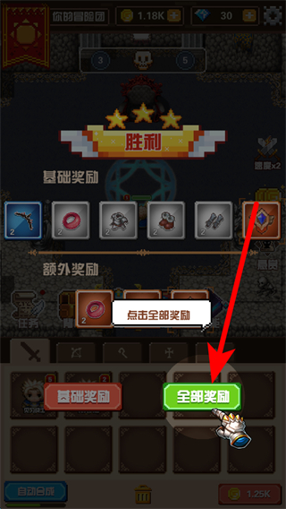 4、完成戰(zhàn)斗后會彈出獎勵界面,記得點擊全部獎勵按鈕領取所有獎勵,這些獎勵包括裝備、道具等,能為后續(xù)養(yǎng)成英雄、強化裝備提供資源支持。