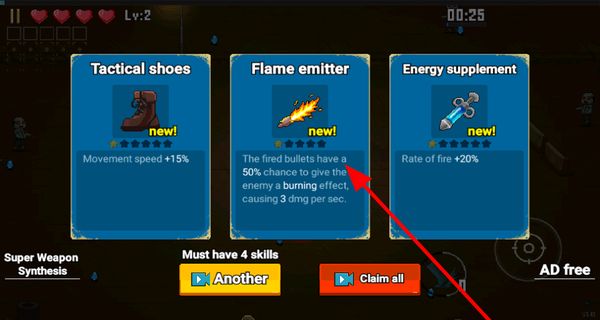 3、在技能選擇界面,挑選合適的技能,像火焰發(fā)射器等,裝備后能增強(qiáng)攻擊效果,更好應(yīng)對(duì)僵尸。