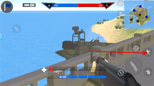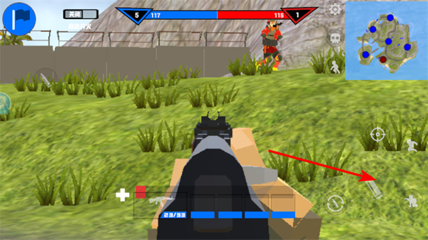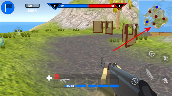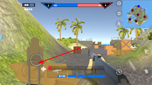 2、操控角色移動,通過左側操控按鈕,控制角色在島嶼場景中移動,尋找掩體和敵方目標。